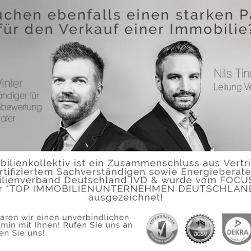 Sonstiges Sie möchten Ihre jetzige Immobilie verkaufen? Das Immobilienkollektiv ist ein Zusammenschluss aus Vertriebsprofi und DEKRA zertifiziertem Sachverständigen des Deutschen Sachverständigen und Gutachter Verbandes sowie Mitglied der Sprengnetter Akademie und Energieberater der Deutschen Sachverständigen Gesellschaft, die Zusammen das Projektmanagement für den Immobilienvertrieb betreiben. Die Immobilienkollektiv GmbH ist weiterhin Mitglied im Immobilienverband Deutschland IVD und wurde vom Magazin FOCUS als eines der "TOP IMMOBILIENUNTERNEHMEN DEUTSCHLANDS" ausgezeichnet (Focus Spezial, Ausgabe 05/2018). Die Firma erstellt als zertifiziertes Sachverständigenbüro im Vorwege von jeder Immobilie kostenlos und unverbindlich eine Wertanalyse für die Eigentümer. Aufgrund dieser Basis wird dann gemeinschaftlich über eine mögliche Zusammenarbeit entschieden. Im Rahmen des weiteren Projektmanagements arbeitet das Immobilienkollektiv mit peripheren professionellen Dienstleistern, wie Baufirmen, Immobilienfotografen (inkl. aufwendigen Drohnenaufnahmen & Immobilienvideos), Home Stagern (Einrichtungs- und Gestaltungsprofis für eine optimale Immobilienpräsentation), Grafik Designern, Handwerkern, Gebäudereinigern, Umzugsunternehmen, Anwälten, 3D und Virtual Reality Agenturen, Notaren, Banken, Finanzierern, Architekten, Medienagenturen und weiteren Immobilienvertrieben zusammen, um das bestmögliche Ergebnis für den Auftraggeber zu erzielen. Die Inhaber verfügen darüber hinaus gemeinsam über eine 20 jährige Erfahrung in der Bau- und Immobilienbranche. Die Kompetenz und der Service gehen somit weit über die eines gewöhnlichen Immobilienvertriebs hinaus. Unter: https://www.immobilienkollektiv.de erhalten Sie alle Informationen. Rufen Sie uns gern an oder schreiben Sie uns!
